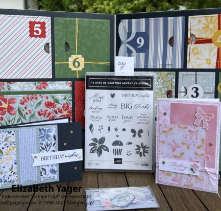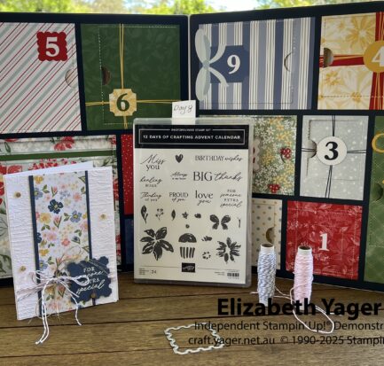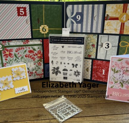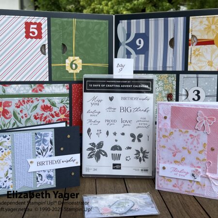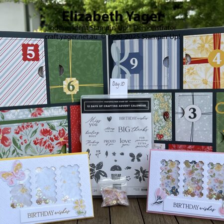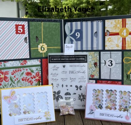 Day 10 had the surprise of more shaker elements!! These are very pretty and are a mixture of flowers, hearts, sequins and butterflies. I made two similar cards one in Pretty in Pink and the other in Daffodil Delight. I cut three window from the four white panel with the rectangle dies from Day 7. […]