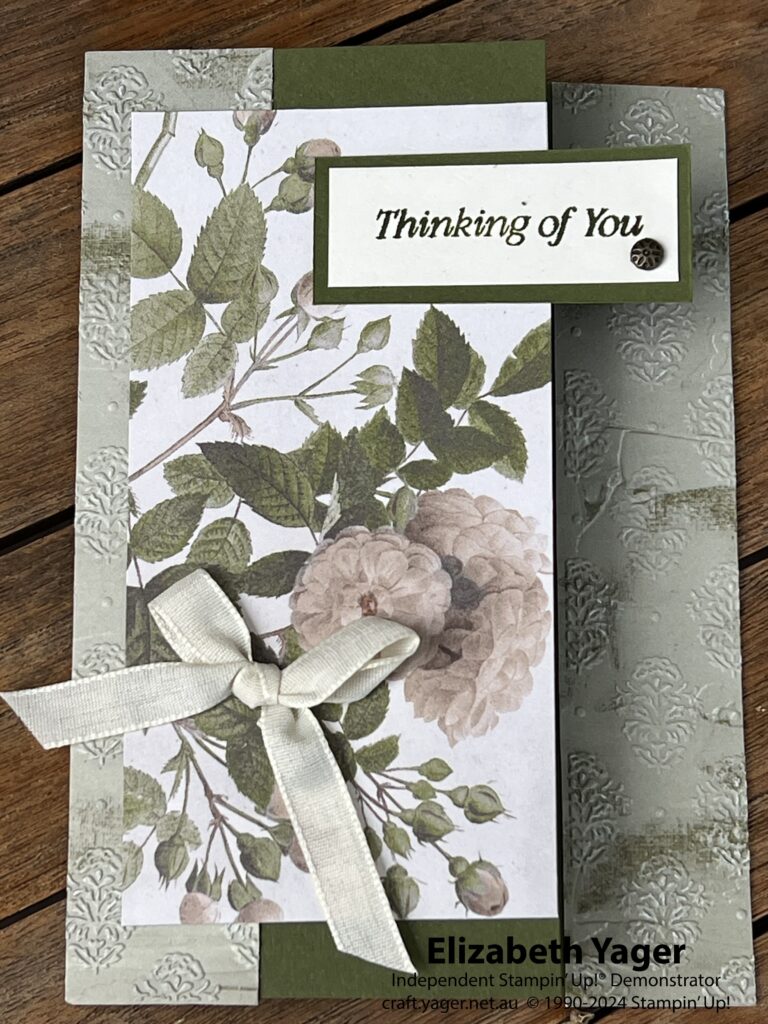 My final card uses a base of Mossy Meadow, and two embossed strips of the DSP. I then added a piece of the Beautiful Gallery (with roses) to this and a sentiment stamped in Mossy Meadow and some Basic Beige ribbon.