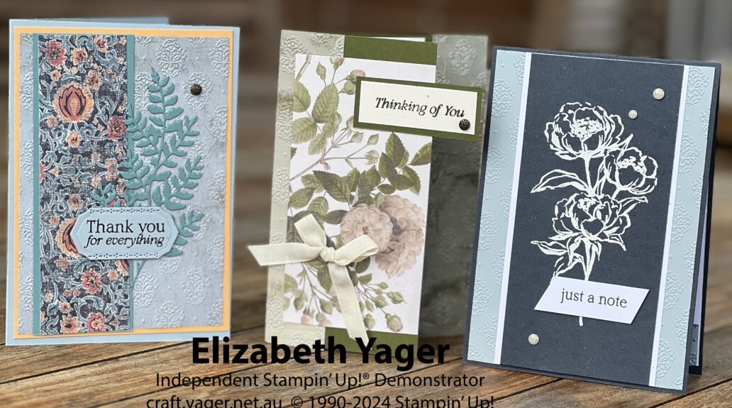 The episode of Timeout Tuesday below show you some of my projects along with a demonstration of how they are made. I guarantee you will want this suite too! The DSP is stunning, as are the stamps, dies, embossing folder and so on. They pair beautifully with the new InColours – especially Cloud Cover and Secret Sea. I hope you can take the time to watch this ‘show and tell’ and that you can take inspiration from how easy it is to create a couple of delightful cards.