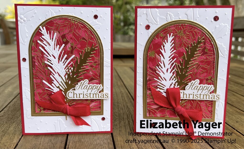 My second card uses Red, White and Gold and the Jolly Holly Embossing Folder as well as the Everyday Arches Dies. The base is Real Red to set off the beautiful red DSP. I gave it an elegant look by using the gold foil and a beautiful red ribbon and one of the sentiments from the Greetings for You Ephemera Pack. The white layer is just embossed with the holly to add texture and sparkle gems are used as well. Hint! -I used the centre part of the layer to cut out the gold pine branches.