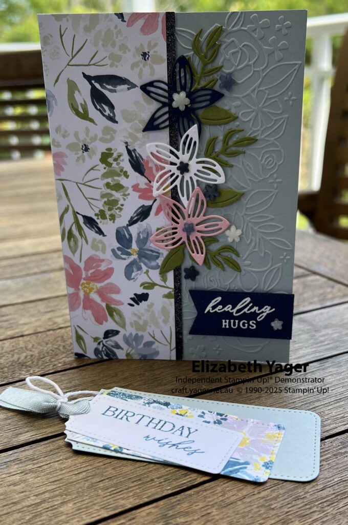 Day 2 contained some beautiful 6 x 6 DSP. I used these along with the gift from Day 1 to create a card for you. The base of the card is Cloud Cover and I embossed the front right with the Glass and Garden Embossing folder. On the left front I added a piece of DSP with a strip of Secret Sea glitter paper behind it. I then added three flowers die cut in Night of Navy, Pretty in Pink and Basic White from one of the dies and some leaves in Old Olive and a sentiment on the bottom right.