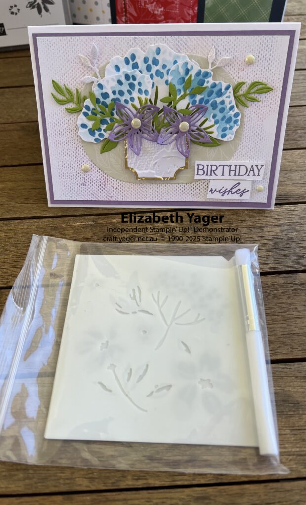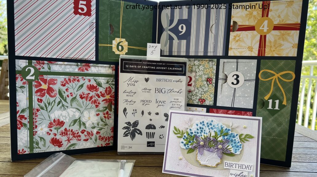 Day 5 has one of the larger windows so I opened wondering what I might discover!! Inside was a set of stencils and a stencil brush. On a closer look, I realised that the stencil was that of some the DSP flowers from Day 2. The stencils are numbered 1-4, so you know which one to use first. Working out what the stencil shapes are is fun and it is good to play around a little with them first just to see what comes up and then you can choose the colours you want. Using a soft stencil paintbrush requires a little different technique from the blending brushes. If you have used these in the past, you won’t have a problem, but the idea is to daub the ink on with the top of the brush instead of brushing it on. It gives a better finish.