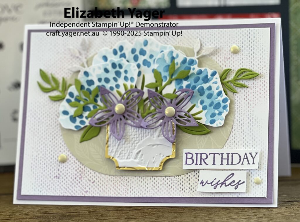 I thought of using it as it was and then decided to use the leaf like design as small flowers in Azure Afternoon. I die cut flowers and leaves with the dies from week 1 and used one of the tags from Day 4that had a gold edging. I ran this through the painted embossing folder to give it a 3D effect and cut it in half to make a vase. I cut an oval from the DSP (Day 2) for the background and then assembled the card.