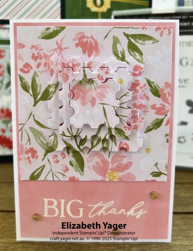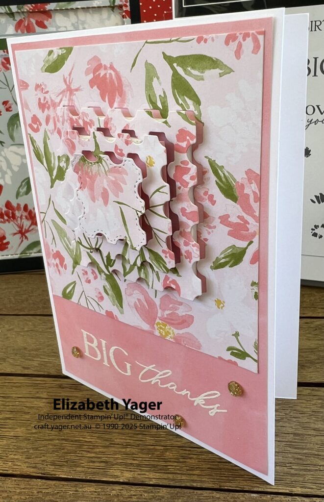 I began experimenting! My first idea was to use the square ones on DSP. Up to now I had not used the pink DSP from Day 2, so thought it would be a perfect choice. I cut out a large square (about 11cm) of the DSP and then cut out the three different nesting sizes from the centre of it. I used the plainer pink DSP as the background and thought this would be a good card to use for the ‘Big Thanks’ stamp from the accompanying stamp set. I embossed this on the bottom of a 10cm x 14.3cm layer.